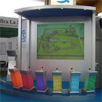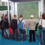At their exhibitions they invite the visitors to give proof of their skills in a Ralley. Directed by a Live-Moderator, six players navigate a virtual ball through all steps of the QS-system (Quality and Safety for Food Products): feeding stuff, producer, slaughter/processing, retail, consumer. Since each player can only apply force to the ball in one direction, only with team spirit and collective leadership the ball reaches its goal.