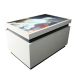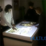 The i|table is a 1,4 x 1 meter large media table. The surface out of acryl glass is built for multitouch interactive applications. By using Adobe Director as software it allows fullscreen realtime 3D content.