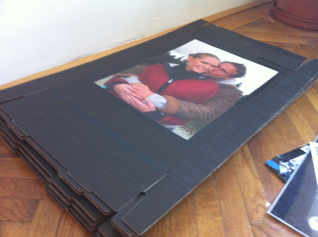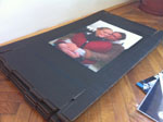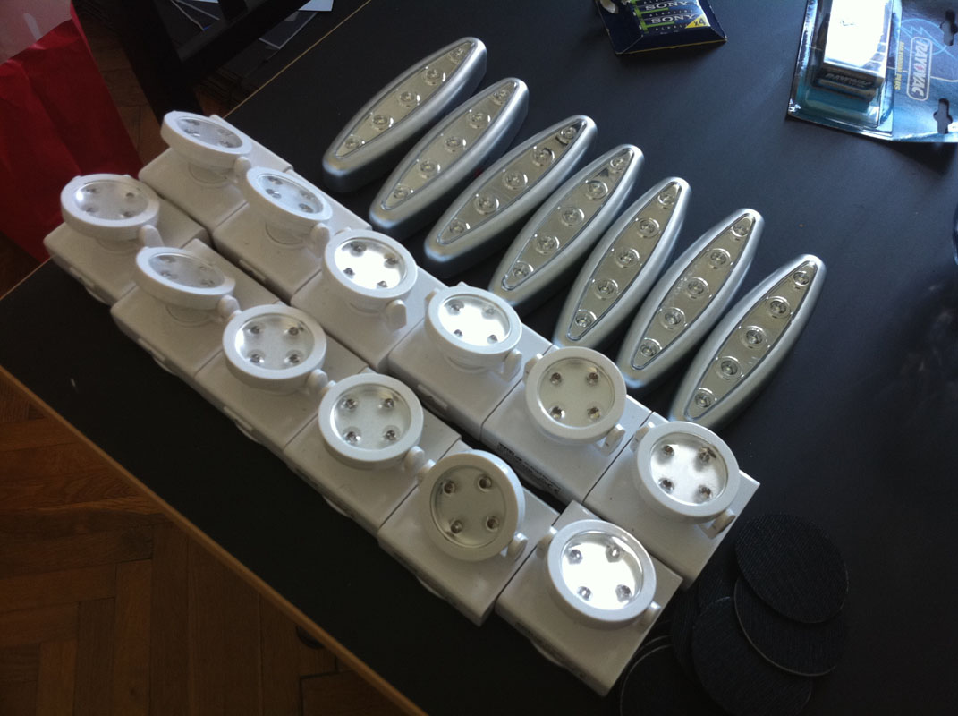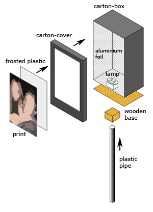 We cut a hole into the black cover and into it we implemented the printed image (A3 format) in front of a white, frosted plastic sheet. Into the box we bonded battery-powered LED lamps. (It took a while to find cheap ones, that have best emission in especially this dimensioned boxes.)